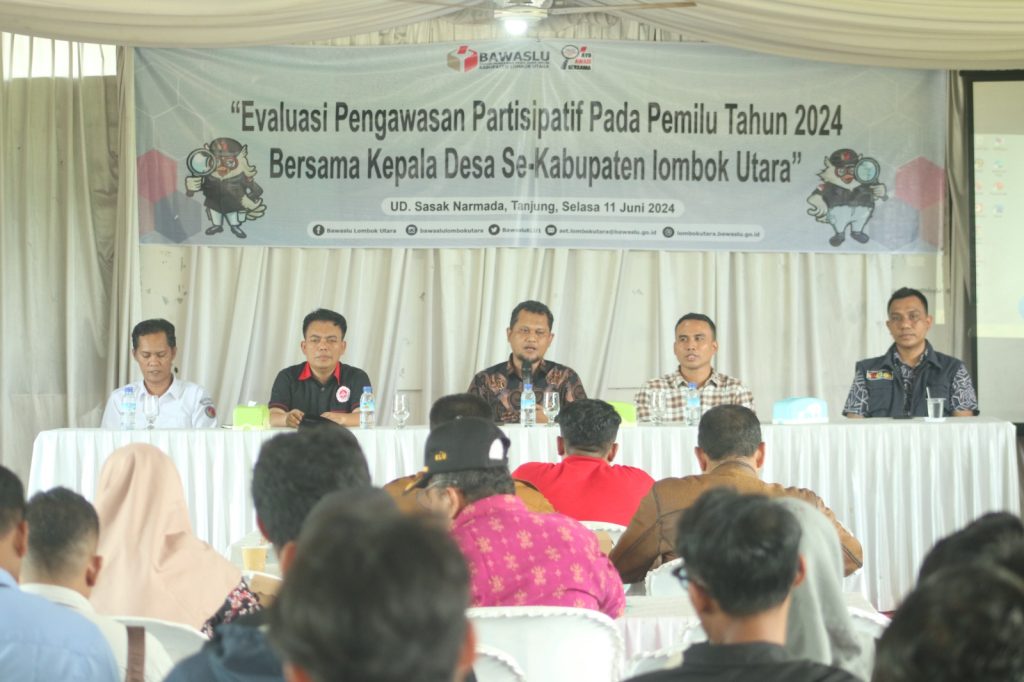 Tanjung--- Dalam rangka mensukseskan Pemilihan Kepala Daerah (Pilkada) pada 27 November 2024 mendatang, Badan Pengawas Pemilihan Umum (Bawaslu) Kabupaten Lombok Utara (KLU), menggelar kegiatan evaluasi pengawasan pemilu partisipatif yang dihadiri oleh Kepala Desa Se-Kabupaten Lombok Utara hal ini bertujuan untuk mengevaluasi terhadap Efektivitas Pengawasan partisipatif yang telah dilakukan di Pemilu 2024, berlangsung di Ud. Sasak Narmada. Selasa, 11/06/2024