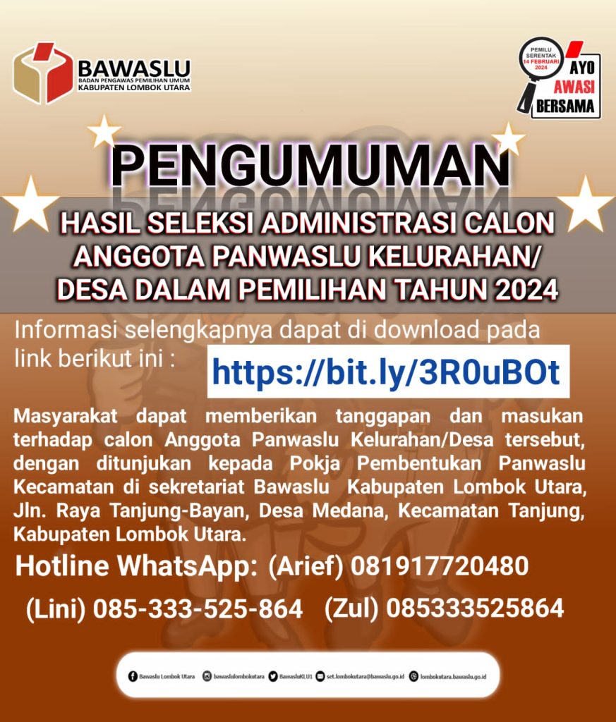 Berikut informasi Pengumuman Hasil Seleksi Calon Anggota Panwaslu Kelurahan/Desa dalam Pemilihan Tahun 2024. Berdasarkan Ketentuan Peraturan Badan Pengawas Pemilihan Umum Republik Indonesia Nomor 19 Tahun 2017 sebagaimana telah beberapa kali di ubah terakhir dengan Peraturan Badan Pengawas Pemilihan Umum Republik Indonesia Nomor 17 Tahun 2023.