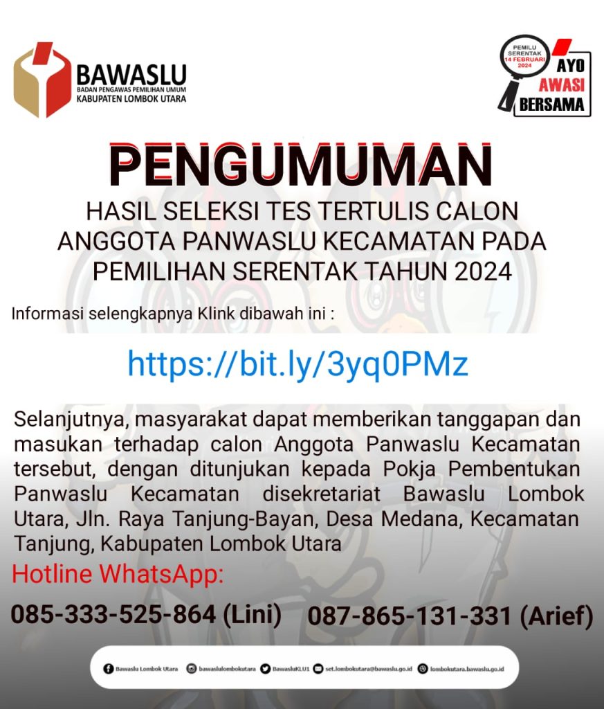 Berikut Pengumuman Bawaslu Kabupaten Lombok Utara Nomor : 06/KP/K/SDMO/5/2024 Tentang Pengumuman Hasil Seleksi Tes Tertulis Calon Anggota Panwaslu Kecamatan Se-Kabupaten Lombok Utara untuk Pemilihan Tahun 2024.
