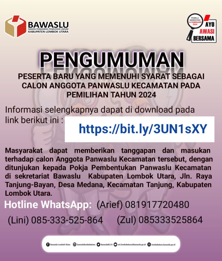Berikut Informasi Pengumuman Nomor : 09/KP/K/SDMO/05/2024 tentang Pengumuman Nama-nama terpilih Panwaslu Kecamatan Dalam Pemilihan Tahun 2024. Berdasarkan ketentuan Peraturan Badan Pengawas Pemilihan Umum Republik Indonesia Nomor 19 Tahun 2017 sebabaimana telah beberapa kali diubah terakhir dengan Peraturan Badan Pengawas Pemilihan Umum Republik Indonesia Nomor 4 Tahun 2022.