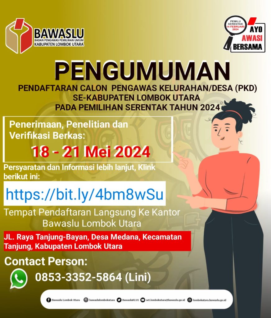 Berikut Pengumuman Bawaslu Kabupaten Lombok Utara Nomor : 07/KP/K/SDMO/5/2024 Tentang Pengumuman Pendaftaran Calon Anggota Panwaslu Kelurahan/Desa dalam rangka Pemilihan Serentak Tahun 2024