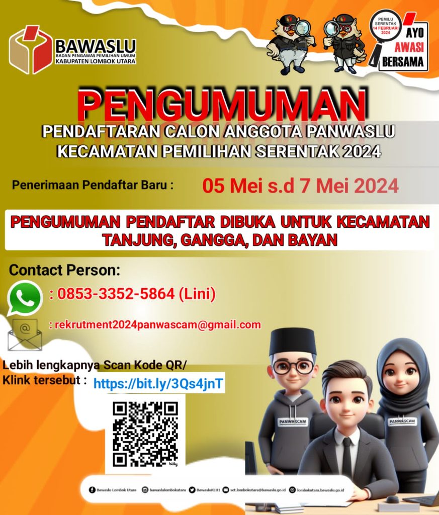 Dalam rangka pembentukan Anggota Panwaslu Kecamatan se-Kabupaten Lombok Utara, maka Tim Seleksi Calon Anggota Panwaslu Kecamatan se-Kabupaten Lombok Utara berdasarkan Keputusan Ketua Bawaslu Kabupaten Lombok Utara Nomor: 02/SK/HK.01.01/K/SDMO/04/2024 tentang Pembentukan Kelompok Kerja Panwaslu Kecamatan dalam Pemilihan Serentak Tahun 2024.